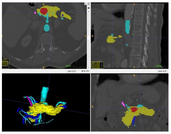 Screenshot of ITK Snap with the tumor in red, the pancreas in yellow, the arteries in light blue, the veins in dark blue and the splint in pink.