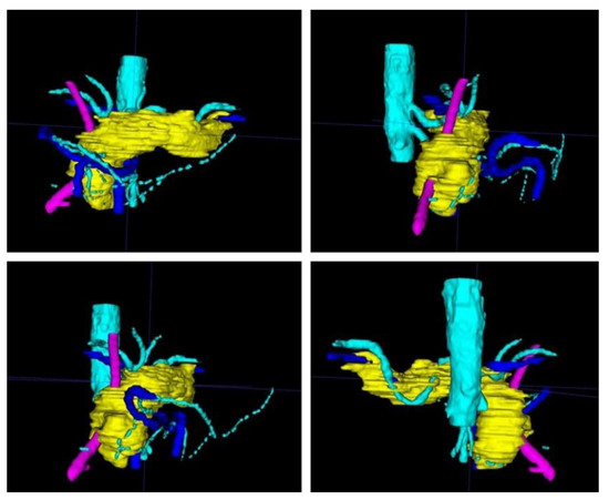 After completion of the final mesh, the pancreas and its surroundings can be viewed from different angles. Note the rather rough surface as the CT scans had a slice thickness of 1 mm. (The pancreas in yellow, the arteries in light blue, the veins in dark blue, and the splint in pink.)