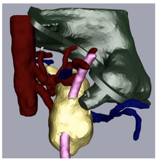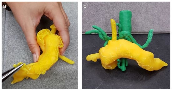 We first focused on developing a transparent method to fabricate a patient-specific 3D replica, allowing for a broad and universal scope of application. Therefore, the interdisciplinary team of surgeons, endoscopists, mechanical engineers, and radiologists aimed to create a user-friendly protocol. It was important to us that even inexperienced students could be able to learn the steps of our method within a short time. Following Bucking et al. [], we divided the process into three parts: image segmentation, mesh refinement, and 3D printing. As a validation of the developed method, we additively manufactured the pancreas and its surroundings of a patient with locally advanced PDAC with a Lulzbot Mini 3D printer (Fargo, ND, USA).