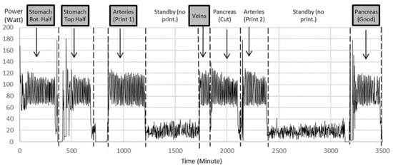 Organ replicas were then 3D printed on the Lulzbot Mini (Step 6). The standard quality with a layer height of 0.18 mm was proven to be sufficient. The power monitoring of the 3D printer as shown in Figure 5 displays the power for 3D printing of different organs and power for standby times over the whole printing procedure of nearly 6 h for an example printing process. Notice the multiple iterations for arteries and pancreas.