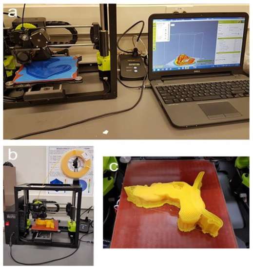 Three-dimensional printing of the replica. (a): Printing of the stomach on the Lulzbot Mini with the power meter in the middle and software, Cura, displayed on the computer; (b): Lulzbot Mini with filament spool; (c): 3D-printed pancreas during the process of printing with stable infill, the supports, the splint, and a cavity at the tumor site where the magnetic field can later be measured.