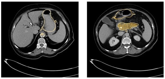 The method described was applied and validated on a patient with locally advanced PDAC. Figure 1 demonstrates one slide of the total CT scan. As this selected patient reported with jaundice, a splint was placed in the common bile duct. The images were exported as NIFTI files and anonymized (Step 1) before being further processed in the program ITK Snap (Step 2).