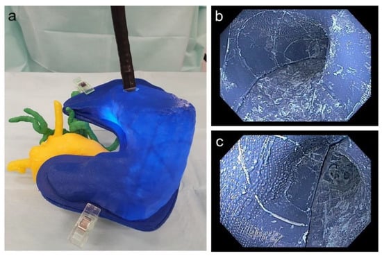 (a) Endoscope inside the stomach with adjacent printed pancreas as well as vessels; (b) endoscopic view of the corpus of the printed stomach; (c) endoscopic view of the antrum of the printed stomach.