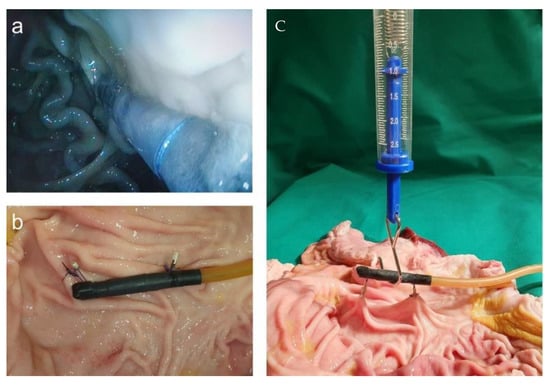 As an optimized magnetic field trap needs to stay in place for a couple of days when employed in patients, we investigated methods for best fixation of the magnetic field trap at the stomach wall. As the easiest method, we added loops at both ends of the magnetic field trap and fixated them to the stomach wall with endoscopic clips (Olympus, Tokyo, Japan). We were also able to additionally train the endoscopists in the realistic endoscopic handling and the fixation by using porcine animal cadavers, acquired from other approved animal experiments directly after euthanization. No ethical approval was needed as we did not work with living animals according to German law and the guidelines of the ethics committee of the LANUV (State Agency for Nature, Environment and Consumer Protection, North Rhine-Westphalia, Germany). The magnetic field trap used was designed as previously described in [] and coated with latex rubber (see Figure 12). After endoscopic placement and fixation of the magnetic field trap, we explanted the stomach and measured the forces that still held the magnetic field trap in place with a spring scale (“SI Manufacturing”, Ontario, Canada) as a model for the real-life situation.