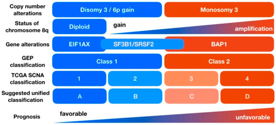 Primary UM are characterized by recurrent chromosome aberrations in chromosomes 1, 3, 6, 8, 9, and 16. These cytogenetic alterations are tightly linked to prognosis, and are used for stratification of patients into risk categories. In primary UM, the most common chromosomal aberrations are 1p loss (28–34%), 1q gain (24%), 3 loss (50–61%), 6p gain (28–54%), 6q gain (28–54%), 6q loss (35–37%), 8p loss (17–28%), 8q gain (36–63%), 9p loss (24%), and 16q loss (16%) [41,42,43]. In particular, monosomy 3 and gain of chromosome 8q correlate with increased metastatic risk, with increasing percentages of monosomy 3 and gain of 8q in tumor cells showing a correlation with worse prognosis [44]. 8p loss has also been associated with a more rapid onset of metastasis, indicative of metastatic efficiency [35]. On the contrary, chromosome 6p gain correlated with a good prognosis, suggesting this aberration could have a functionally protective effect [45]. It may also be that 6p gain portends a better prognosis simply because it is mutually exclusive with monosomy 3 [35]. Monosomy 3 appears to be an early event, while loss of 1p, 8p, and gain of 8q as secondary events in UM development, relating to large tumor size [42,43].