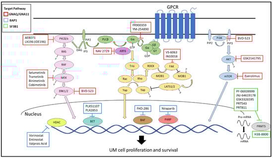 Oncogenic Gα signaling also results in constitutive activation of the PI3K/AKT/mTOR pathway. A small 13 patient phase II trial of the mTOR inhibitor everolimus combined with somatostatin receptor agonist pasireotide had limited clinical benefit [141]. Pre-clinical studies suggested PI3K inhibitors had limited effects as monotherapy, but they had synergistic effects against tumor growth when combined with a MEK inhibitor or PKC inhibitor [142,143]. The PKC inhibitor AEB071 and the PI3K-α inhibitor BYL719 drug combination is currently being tested in a clinical phase I study (NCT02273219). The potent synergy between everolimus (mTOR inhibitor) and the PI3K inhibitor GDC0941 was demonstrated in drug combination screening of UM cell lines, which may be another possible combination for MUM [144].
