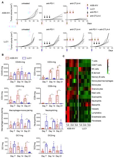 LLC1 is resistant to immune checkpoint blockades, while ASB-XIV is sensitive. (A) BALB/c (n = 5) and C57BL/6 mice (n = 6) were subcutaneously inoculated with 1 × 106 cells of ASB-XIV and LLC1 lung cancer cells, respectively. Then, mice received anti-PD-1 (200 μg), anti-CTLA-4 mAb (100 μg), or a combination of both treatments. Anti-PD-1 was administered on days 3, 6, and 9. Anti-CTLA-4 mAb was administered on days 0, 4, and 8. (B) Tumor-infiltrating immune cells in ASB-XIV and LLC1 tumors (n = 4) were analyzed by flow cytometry on days 7, 14, and 21. (C) RNA expression of LLC1 tumors (n = 3) was evaluated on days 7, 14, and 21. The composition of tumor-infiltrating immune cells was evaluated by mMCP-counter. * p < 0.05, ** p < 0.01, *** p < 0.001.