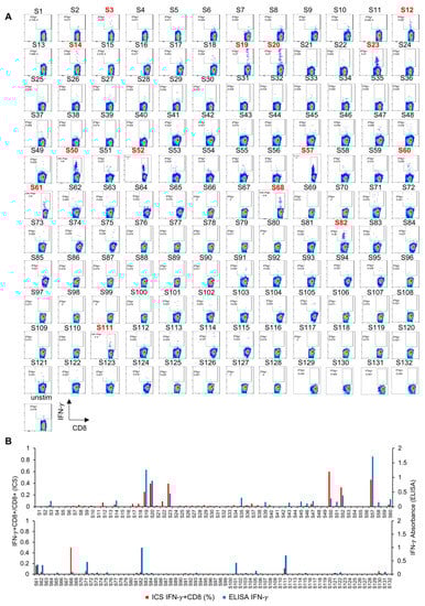 C57BL/6 mice were immunized with DCs pulsed with these neoantigen peptides in the form of short peptides (8- to 10-mers). After two rounds of DC immunization (2 weeks), spleen cells were harvested and tested for reactivity to the immunizing peptide by ex vivo intracellular cytokine staining (ICS) (Figure 2A,B). Fourteen peptides were found to induce peptide-specific IFN-γ-producing CD8+ T cells. Spleen cells were also cultured with immunizing peptides for 5 days and restimulated with the corresponding peptides. IFN-γ production was measured by ELISA (Figure 2B). After in vitro expansion culture, IFN-γ production was detected in 23 peptide-stimulated cultures. Altogether, 25 mutated peptides were identified that displayed immunogenicity on DC vaccination.