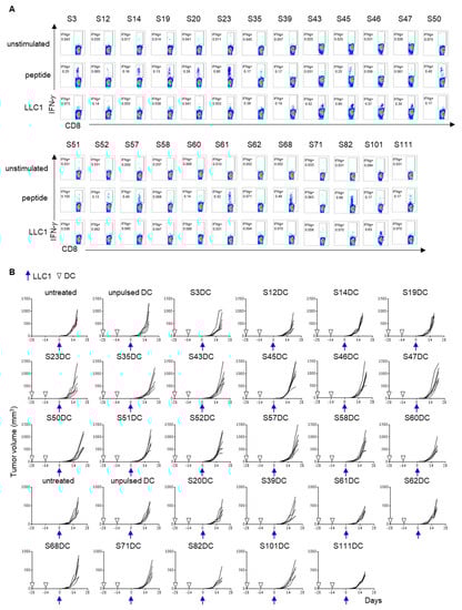 The immunogenicity and anti-tumor activity of 25 short mutated peptides. DCs were pulsed with one of these 25 mutated peptides. Groups (8–10 mice per group) were immunized twice with each peptide-pulsed DC vaccine (1 × 106) at a 2-week interval. Three or four mice were used for immunogenicity assessment (A), and 5–6 mice were used for the LLC1 cells challenge (B). IFN-γ production in response to immunized peptide and LLC1 cells was evaluated. In addition, tumor growth was measured after LLC1 cells (1 × 106) were challenged in these immunized mice.
