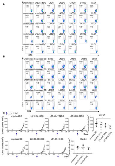 To further investigate the efficacy of the 25 candidate neoantigens, 19 LPs (21-mer), which incorporated the corresponding immunogenic 25 short peptide sequences, were synthesized and pulsed onto DCs (Table S2). Although CD4+ and CD8+ spleen cells from mice vaccinated with these LP-pulsed DCs produced IFN-γ in response to the immunizing peptide (Figure 4A,B), their response to LLC1 tumor cells was barely detectable. The anti-tumor activity of these LP neoantigen-pulsed DCs peptides was also evaluated by prophylactic DC vaccination for which DCs pulsed with each of 25 LPs were mixed (three or four different LP-pulsed DCs in one vaccine) to yield five different vaccine products that were used to immunize mice twice at a 2-week interval. Two weeks after the final immunization, vaccinated mice were challenged with LLC1 cells. LLC1 tumor growth was partially suppressed in some vaccinated mice. The most active mixture included L57, L58, L62, and L82 LPs (p = 0.042) (Figure 4C).