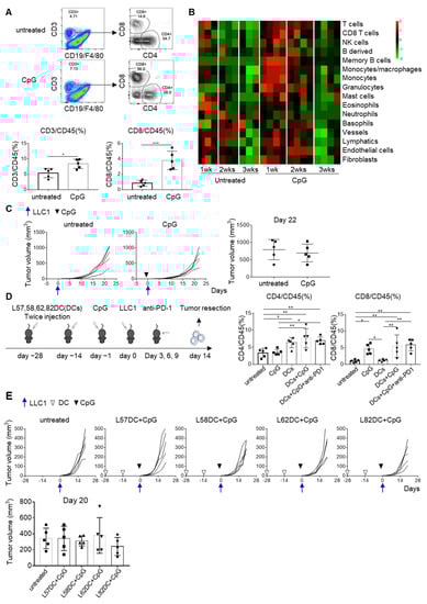 CpG treatment turned cold tumors into hot. (A) CpG (30μg) was subcutaneously administered to C57BL/6 mice (n = 5) one day before 1×106 LLC1 cells inoculation. Tumors were harvested on day 14 and tumor-infiltrating lymphocytes were analyzed by flow cytometry. (B) RNAs were extracted from days 7, 14, and 21 tumors and subjected to RNA-Seq. The composition of tumor-infiltrating immune cells was analyzed using the mMCP-counter. (C) C57BL/6 mice (n = 5) were either treated with 30μg CpG or left untreated, and LLC1 tumor growth was evaluated. (D) C57BL/6 mice were divided into five groups (five mice per group): (1) untreated; (2) CpG treatment; (3) the mixture of L57, L58, L62, and L82 LP-pulsed DC (1 × 106 each) vaccination; (4) the combination of DC vaccination and CpG; and (5) the triple combination of DC vaccination, CpG and anti-PD-1 mAb (200μg). Mice received DC vaccination on days −28 and −14. CpG was administered on day −1. Mice received anti-PD-1 mAb on days 3, 6, and 9 after the LLC1 challenge (1 × 106). On day 14, tumors were resected and subjected to the analysis of tumor-infiltrating cells. CD4/CD45 (%): untreated vs. DCs (p = 0.0316), untreated vs. DCs+CpG (p = 0.0021), untreated vs. DCs+CpG+anti-PD-1 (p = 0.0096), CpG vs. DCs+CpG (p = 0.0035), CpG vs. DCs+CpG+anti-PD-1 (p = 0.0161); CD8/CD45 (%): untreated vs. CpG (p = 0.0199), untreated vs. DCs+CpG (p = 0.0038), untreated vs. DCs+CpG+anti-PD-1 (p = 0.0018), CpG vs. DCs (p = 0.0336), DCs vs. DCs+CpG (p = 0.0066), DCs vs. DCs+CpG+anti-PD-1 (p = 0.0032). (E) Tumor growth was compared in these five groups. * p < 0.05, ** p < 0.01, *** p < 0.001.