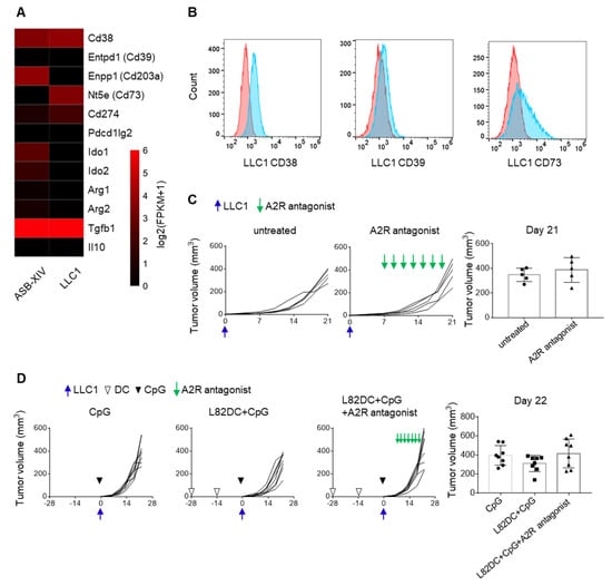 To further increase the efficacy of neoantigen DC vaccines, the expression of immunosuppressive molecules in LLC1 cells were screened by RNA-Seq. As shown in Figure 6A, Cd38 and Nt5e (CD73) mRNAs were highly expressed in LLC1 cells. Furthermore, the expression of molecules associated with the adenosine pathway, namely, CD38, CD39 and CD73, were detected on the LLC1 cell surface by flow cytometry (Figure 6B). Therefore, A2A and A2B adenosine receptor antagonists (SCH 58261 and PSB 1115) were combined with prophylactic L82-pulsed DC vaccination and CpG. However, L82-pulsed DC vaccination together with CpG or in combination with A2R antagonists failed to suppress LLC1 tumor growth (Figure 6C,D).