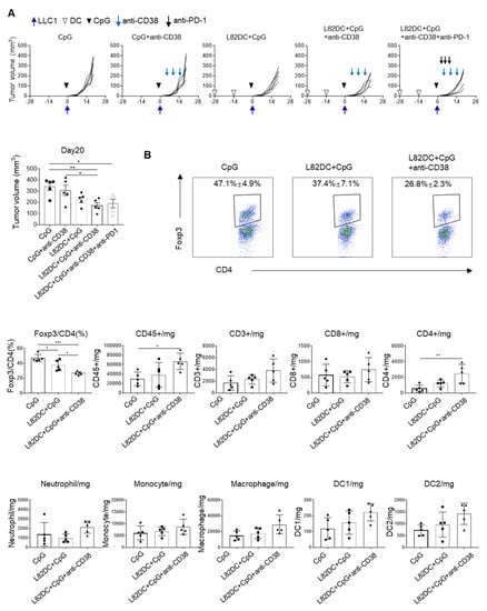 In addition to the adenosine pathway, CD38 is also involved regulatory T cells (Tregs). Tregs were reduced in the tumor when LLC1-bearing mice were treated with anti-CD38 (Figure S3). In contrast, the combination of anti-CD38 antibody, L82-pulsed DC vaccine, and CpG suppressed LLC1 tumor growth (p = 0.019), although neither anti-CD38 mAb nor L82-pulsed DC monotherapy alone could do so (Figure 7A). We also tested a combination of anti-CD38, L82-pulsed DC vaccine with CpG, and anti-PD-1 mAb but this did not result in any enhancement of the anti-tumor activity of the treatment. On day 14 LLC1 tumors, we found that the combination with DC vaccine and anti-CD38 decreased the amount of intra-tumoral regulatory T cells (Tregs) (p = 0.0001) (Figure 7B), while there was no significant difference in CD8+ T cells in the treatment groups.