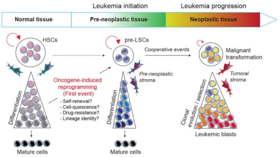Self-renewal is defined by the functional property of stem cell populations that undergo symmetric or asymmetric divisions to preserve tissue integrity and homeostasis in normal development. In adult hematopoiesis, sustained self-renewal is a distinctive function of normal hematopoietic stem cells (HSCs) which is tightly controlled by a network of transcription factors [5], whereas committed hematopoietic progenitors are devoid of this stem cell property. Thus, it was originally thought in myeloid malignancies that the biological features of leukemic stem cells (LSCs) come from reminiscent states of normal HSCs in which self-renewal is a central property in the process of leukemia initiation. In particular, pioneering studies in chronic myeloid leukemia (CML) considered that the primary oncogenic event takes place in rare and self-renewing multipotent stem cells [6,7], and established the concept that these cells are prone to transformation because of their unique self-renewal capacity. In acute myeloid leukemia (AML), the notion that leukemia originates from an HSC or a committed progenitor is debated in the field. The phenotypic characterization of LSCs in the original studies led to the idea that AML is organized in a hierarchical pattern, in a way similar to that of normal hematopoiesis and derive from the malignant transformation of a primitive hematopoietic cell [8,9]. Supporting this notion, some murine leukemia models have led to show that AML-initiating mutations occur at the level of HSCs and alter their self-renewal properties [10,11]. However, there is evidence that leukemia-initiating activity can be observed not only in an immature cell population but also in populations corresponding to a range of normal committed progenitors. Indeed, a number of studies brought evidence that more mature progenitors, that normally lack any potential for self-renewal, may be the cells-of-origin in AML [12,13,14,15,16]. Thus, oncogenic transcription factors can destabilize the normal molecular program of target cells, leading to changes in gene expression and to a total or partial loss of the original cell identity.