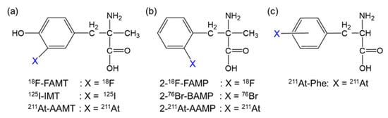 Structure of radiohalogen-labeled amino acids targeting LAT1. Radiohalogen-labeled (a) α-methyl-L-tyrosine, (b) α-methyl-L-phenylalanine, and (c) L-phenylalanine derivatives.