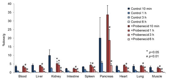 Biodistribution of 2-211At-AAMP in tumor-bearing mice with or without intraperitoneal injection of probenecid (mean ± SD, n = 4–5). * p < 0.05 and # p < 0.01 compared with the control group (without probenecid preloading).