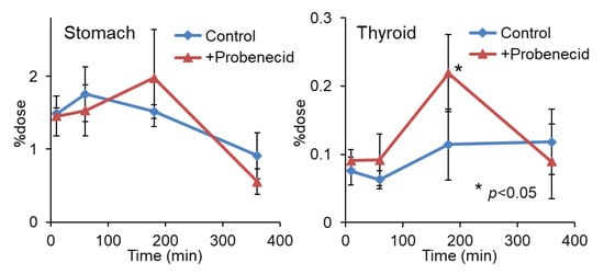 Stomach and thyroid radioactivity levels after injection of 2-211At-AAMP in normal mice with or without intraperitoneal injection of probenecid (mean ± SD, n = 4). * p < 0.05 compared with the control group (without probenecid preloading).