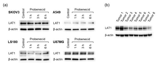 LAT1 expression in cell lines and excised tumors. (a) Four cell lines (SKOV3, A549, LS180, and U87MG) treated with probenecid (1 mM) and (b) SKOV3 tumors excised from eight tumor-bearing mice.