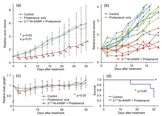 Therapeutic effect of 2 MBq 2-211At-AAMP in tumor-bearing mice with or without intraperitoneal injection of probenecid (mean ± SD, n = 5–6). (a) Average tumor growth, (b) individual tumor growth, (c) average body weight change, and (d) Kaplan–Meier survival curves after treatment. * p < 0.05 and # p < 0.01 compared with the control group.