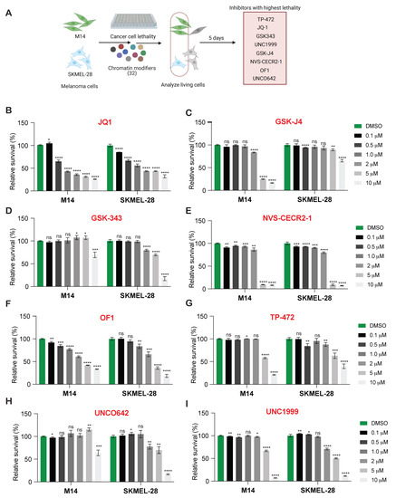 Pharmacological inhibition of epigenetic chromatin modifiers inhibits melanoma growth in short-term survival assays. (A). Schematic illustration of the druggable screening approach using 32 different epigenetic regulators with 2 different melanoma cell lines (M14 and SKMEL-28). (B–I). Indicated melanoma cell lines were treated with different concentrations of various epigenetic regulators for 5 days and analyzed for survival using the MTT assay. Relative cell survival is plotted relative to vehicle-treated cells. Data represent the mean ± SEM. * p < 0.05, ** p < 0.01, *** p < 0.001, **** p < 0.0001, ns = not significant.