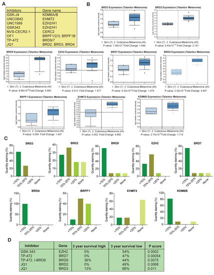 Overexpression of BRD7/9, BRD2/3, and EZH2 in melanoma samples is correlated with poor prognosis. (A). List of compounds that inhibited melanoma cell growth and their epigenetic targets. (B). Indicated patient melanoma datasets were analyzed for the shown epigenetic regulators using Oncomine. Gene upregulation in patient’s melanoma samples relative to expression in normal skin using Oncomine-Talantov melanoma patient dataset is shown. (C). Immunohistochemical analysis of the expression of indicated epigenetic regulators using the Human Protein Atlas dataset. Relative quantity staining for each of the epigenetic regulators are shown. (D). Survival analysis (three year) of melanoma patients based on the high and low expression of the epigenetic regulators using Human Protein Atlas datasets is shown.
