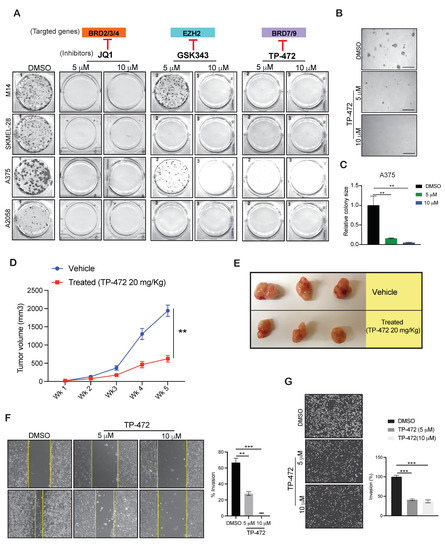 TP-472 inhibit melanoma growth in long-term survival assays, tumor growth in in vivo xenograft melanoma mouse model and invasion and migration in in vitro cell culture model. (A). Indicated melanoma cell lines were treated with the different concentrations of GSK343, JQ1, and TP-472 for 2 weeks. Cell survival was then measured using clonogenic assays. Representative images are shown. (B,C). A375 cells were treated with various concentrations of TP-472 and analyzed for ability to grow in an anchorage-independent manner in soft agar assays. Representative images of soft agar assays are shown. Scale bar, 500 μm (B). Bar diagram showing the relative colony size for each condition in panel B (C). (D). A375 cells were injected subcutaneously into the flanks of NSG mice (n = 6). The mice were treated with either vehicle or TP-472 (20 mg/Kg body weight) via intraperitoneal injection three times a week. The average tumor volume for each week is plotted. (E). Representative tumor images of NSG mice in vehicle and TP-472 treated mice at the end of the experiment. (F). A375 under indicated conditions were analyzed for the migration using wound-healing assay. Representative images showing the extent of migration in TP-472 treated cells relative DMSO treated cells are presented on the left and the quantification is presented as a bar diagram on the right. (G). A375 under indicated conditions were analyzed for invasive capacity using Matrigel invasion assay. Representative images of TP-472 treated invaded cells relative DMSO treated invaded cells are shown on the left and the quantification is presented as a bar diagram on the right. Data represent the mean ± standard error of three biological replicates. ** p < 0.01 and *** p < 0.001.