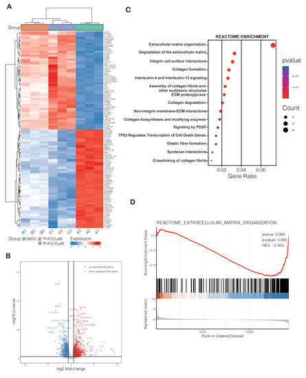 Transcriptome-wide mRNA expression profiling revealed that TP-472 treatment leads to downregulation of several extracellular matrix (ECM) proteins. A375 cells were treated with either DMSO, 5 μM TP-472, or 10 μM TP-472 for 24 h, after which RNA sequencing was performed. (A). Heatmap showing the top 100 genes exhibiting altered expression after 24 h of TP-472 treatment. (B). Volcano plot showing the top 100 genes exhibiting altered expression after treatment. (C). Reactome-based functional pathways analysis identified pathways that were significantly activated or suppressed in A375 cells treated with TP-472. (D). Reactome-based functional pathways revealed that several genes associated with ECM organization were downregulated.