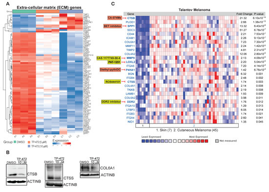 Finally, we examined how TP-472 inhibits melanoma growth and metastases in vitro using cell cultures as well as in vivo in mice. An unbiased, large-scale mRNA expression profiling analysis was conducted on A375 melanoma cells treated with either DMSO or with 5 µM or 10 µM TP-472 for 24 h. Treatment with TP-472 at either 5 µM or 10 µM resulted in the upregulation of 932 genes and downregulation of 1063 genes (Table S4). The degree of change in expression (both up- and downregulation) was greater in cells treated with 10 µM TP-472 than in cells treated with 5 µM TP-472, indicating that TP-472 affects mRNA expression of its target genes in a concentration-dependent manner. Our analysis revealed that many of the top 100 significantly downregulated genes encode ECM proteins (Figure 4A,B). Reactome-based functional pathway enrichment analysis revealed that downregulation of several of these ECM protein genes led to significant inhibition of various pro-oncogenic pathways, such as ECM organization, integrin cell surface interaction, collagen formation and degradation, and non-integrin membrane-ECM interactions (Figure 4C,D). Significantly downregulated ECM proteins that affected ECM-regulated pro-oncogenic pathways included collagens, fibronectins, integrins, and matrix metallopeptidase (Figure 5A). We confirmed the expression of a few downregulated ECM proteins (CCSS, CTSB, COL6A1) identified in the RNA sequencing analysis using immunoblotting (Figure 5B). Many ECM proteins, such as integrins and collagens, are known to play critical roles in supporting tumor structure and matrix rigidity and modulating the tumor microenvironment, which affects many intra- and extracellular signaling pathways [20,21]. Thus, targeting these proteins can impact immunogenicity, tumor growth, and proliferation, as well as therapy response [22,23].