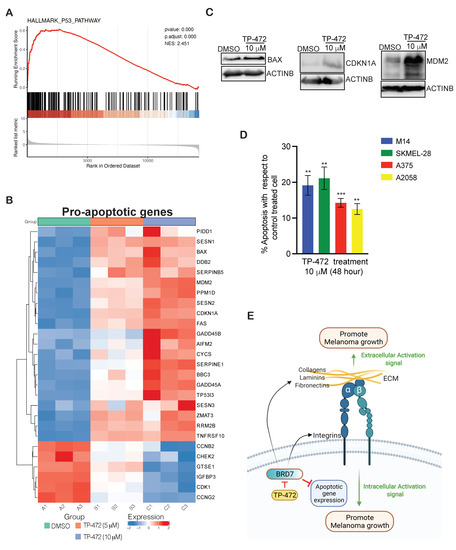 Transcriptome-wide mRNA expression profiling revealed that TP-472 treatment leads to upregulation of pro-apoptosis genes in melanoma cells. (A). Reactome-based functional pathways analysis revealed upregulation of several genes associated with the p53 pathway and apoptosis. (B). Heatmap showing the several pro-apoptosis genes that were upregulated after 5 μM, or 10 μM of TP-472 treatment. (C). A375 cell line was treated with 10 μM of TP-472 for 24 h. Immunoblotting was performed to measure the protein expression of the shown candidates. ACTINB were measured as loading controls. (D). Bar diagram showing apoptosis of melanoma cells treated with 10 μM TP-472 for 48 h (percentage apoptosis in inhibitor-treated cells relative to vehicle-treated control cells). (E). Model showing that TP-472 treatment of melanoma cells leads to suppression of ECM-mediated pro-oncogenic signaling pathways and activation of apoptosis genes, ultimately leading to inhibition of melanoma cell growth and proliferation. Data represent the mean ± SEM. ns = not significant, ** p < 0.01, *** p < 0.001.
