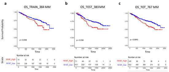 Kaplan–Meier survival curves in 384 MM train (a) and 383 MM test (b) sets that were randomly selected from total 767 MM dataset. MM cases were stratified in high and low MIAT expression groups, accordingly to max-stat cut-off identified in the train set with respect to Overall Survival (OS) data. (c) Kaplan–Meier survival curve based on the same threshold in 767 global dataset: OS median follow-up time: not reached for low group, 1789 days for high group; median follow-up time of the study 1429 days; Inter Quartile Range (IQR): [796; 1718]. Log-rank test p-values measuring the global difference between survival curves and number of samples at risk in each group across time are reported.