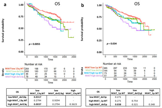 Based on previous evidence and the observed differential expression patterns according to main molecular alterations (Figure 1), we wanted to evaluate the possible impact on survival of MIAT expression level in combination with the other significantly associated molecular variables, like t(11;14), t(4;14), MYC-trx, del(13q)/RB1, del(1p)/CDKN2C or HD. Notably, the combination of higher MIAT expression level with the occurrence of 13q/RB1 or 1p/CDKN2C deletions was associated with the poorest survival rate in OS (Figure 3a,b). In contrast, the most favorable one was identified in the lower MIAT expression group respectively associated with a normal copy number (CN) state at 13q/RB1 (Figure 3a) (BH adj. Log-Rank p-value = 0.0037) or 1p/CDKN2C (BH adj. Log-Rank p-value = 0.038) (Figure 3b). No significant differences were detected for MIAT expression combined with t(11;14), t(4;14), MYC-trx, or HD condition.