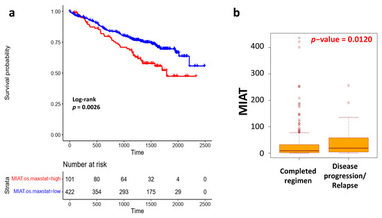 (a) Kaplan–Meier survival curve in 523 MM cases treated with bortezomib, bortezomib/IMIDs, or bortezomib/IMIDs/carfilzomib in high compared to low MIAT group, according to previously defined max-stat cut-off relative to OS. Log-rank test p-value is reported. (b) Box plots of MIAT expression level in 287 MM cases that reached a completed regimen in comparison to 69 MM patients who experienced disease progression/relapse after bortezomib treatment. Differential expression was tested by the Wilcoxon rank-sum test with continuity correction.