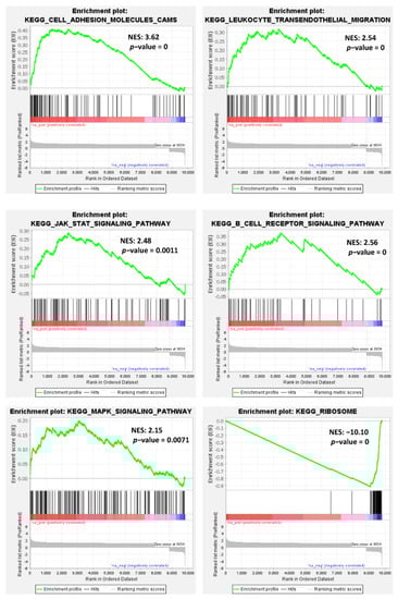 To identify which molecular pathways could be modulated in relation to MIAT expression, we performed a Gene Set Enrichment Analysis (GSEA) on the list of DE coding genes ranked based on FC values, using different gene set collections. Notably, we found the positive modulation of transcripts involved in cell adhesion, cellular junctions and transendothelial migration, B cell receptor signaling, and other pathways, like those concerning JAK-STAT, MAPK, and TNFA-NFKB signaling (Supplementary Table S4, Figure 5). In addition, several gene sets associated with immune response or related to mitotic spindle or apoptosis and TP53 pathways were found up-regulated in MM cases with higher MIAT expression levels (Supplementary Table S4, Supplementary Figure S11). Conversely, genes involved in DNA repair or MYC target genes were found down-regulated in patients with higher MIAT expression (Supplementary Table S4, Supplementary Figure S11). To note, transcripts codifying for virtually all the protein constituents of the ribosome were also down-regulated in MM with higher MIAT expression levels (Figure 5 and Supplementary Table S5).