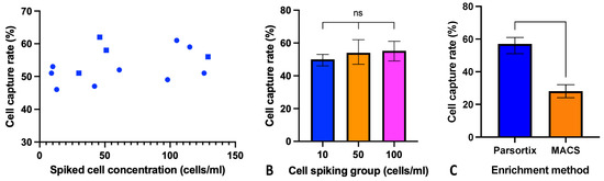 An alternative method of CTC enrichment uses negative depletion of CD45-positive cells via MACS; we compared this method to Parsortix microfluidic enrichment. When evaluating capture rates of a target cell count of 100 cells/mL whole blood, Parsortix demonstrated significantly increased cell capture (57.0% vs. 28.0%, respectively, t-test, p = 0.0008) (Figure 2C).