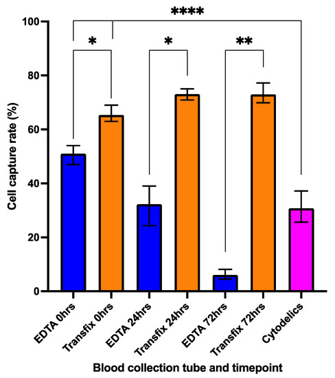 We investigated the impact of blood collection tube (BCT) and sample time to processing upon cell capture rate. Our rationale was to investigate whether a preservative (fixative)-based BCT impacted cell capture rate and if capture rate altered over time with differing BCTs-given that clinical samples are often not processed immediately, especially samples from multi-site trials. The Transfix BCT was compared to a standard EDTA BCT at 0 h, 24 h and 72 h storage timepoints, and both compared to the Cytodelics whole blood preservation kit. The Cytodelics kit (Stockholm, Sweden) was tested because it allows whole blood to be frozen (unprocessed) and stored for up to 1 year at −80 °C, thus raising the possibility of long-term storage of CTC samples, a strategy previously untested. Cytodelics-processed samples were frozen at −80 °C for 24 h before thawing and processing.