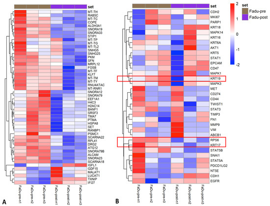 Differential gene expression analysis of FaDu cell line before and after Parsortix microfluidic enrichment demonstrates a cell stress response and downregulation of keratin proteins. Heatmap of differential gene expression analysis of paired unfixed FaDu cells before and after Parsortix enrichment. (A) The top 50 differentially expressed genes are displayed, the majority of which are downregulated and involved in mRNA/RNA and ribosomal protein processing. Upregulated genes indicate an oxidative stress response. (B) Heatmap of gene expression for specific HNSCC/CTC target markers. Three genes (keratins 17 and 19 and ribosomal protein S6, highlighted within red boxes) demonstrated differential expression and downregulation after Parsortix enrichment; the remaining genes were not differentially expressed before and after enrichment.
