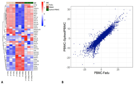 Proof-of-principle that a rare cell population (epithelial CTC) can be identified using bulk sequencing of Transfix preserved, Parsortix enriched blood samples. Analysis of gene expression from “bulk sequencing” of Transfix preserved and Parsortix enriched healthy donor blood samples spiked with 1000 FaDu cells (n = 3). (A) Heatmap to visualise gene expression of the aforementioned HNSCC/CTC target gene list. Note that epithelial and key HNSCC pathway genes are highly expressed in the “spiked-PBMC” population, indicating the presence of enriched epithelial (FaDu) cells. (B) Scatterplot of differentially expressed genes between the Parsortix enriched “spiked-PBMC” samples and PBMC controls vs. the FaDu and PBMC control samples. Axes denote Z-score as a measure of number of standard deviations of the significant difference in gene expression between samples, i.e., negative values are downregulated genes and positive values upregulated genes. High correlation (Pearson R = 0.933, Spearman R = 0.934, p < 0.001) confirms the presence of FaDu specific, i.e., rare epithelial cell, transcripts detectable from the enriched rare cell population.