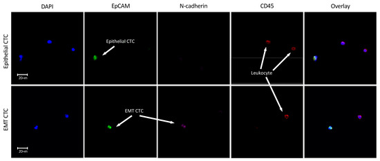 Immunofluorescent images from patient no. 1 demonstrating different CTC phenotypes. Images obtained on a Leica DM6000B microscope at 40× magnification. Top row-an EpCAM+ CD45− (DAPI+) epithelial CTC is labelled next to two EpCAM- CD45+ leukocytes. Bottom row–a CD45- EpCAM+ cell also with low expression of N-cadherin, indicating the process of a transition from an epithelial to mesenchymal (EMT) phenotype.