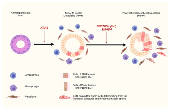 In the last few years, large scale genomic and transcriptomic studies in human PDAC samples, as well as in vivo experimental studies in genetically engineered mouse models, have led to the characterization of the main genetic alterations associated with PDAC and to a better understanding of the evolutionary trajectory of the disease progression. Carcinogenesis of PDAC is driven by progressive accumulation of mutations in multiple genes, among which the most important are the oncogene KRAS and the tumor suppressor genes p53, CDKN2A, and SMAD4 [15,16]. These genetic perturbations are accompanied by specific morphological changes that represent different stages of tumor progression. In the majority of cases, the first step of those changes is believed to be a process of acinar-to-ductal metaplasia (ADM), during which acinar/centroacinar cells transdifferentiate into duct-like cells [17,18,19]. This transdifferentiation process is followed by the formation of precursor lesions, termed as Pancreatic Intraepithelial Neoplasia (PanIN), with increasing histologic grades of dysplasia, comprising cuboidal to columnar epithelial cells with aggravation in cellular atypia and architectural distortion (Figure 1). The next step of high grade PanIN is the development of invasive carcinoma [20,21]. Signature genetic alterations occurring in the PDAC tumorigenesis process that drive progression of pre-invasive lesions (ADM, low grade-PanIN, high grade-PanIN) to invasive disease are depicted in Table 1. This progression from normal histology to pre-invasive lesions and invasive tumors is accompanied by the formation of a desmoplastic and fibroinflammatory microenvironment, characterized by the recruitment of heterogenous stromal and immune cells and the production of a dense extracellular matrix [22,23,24]. Even though accumulated knowledge has provided valuable insight into the molecular changes that promote PDAC evolution, they have failed to translate into new targeted therapeutic options for patients.