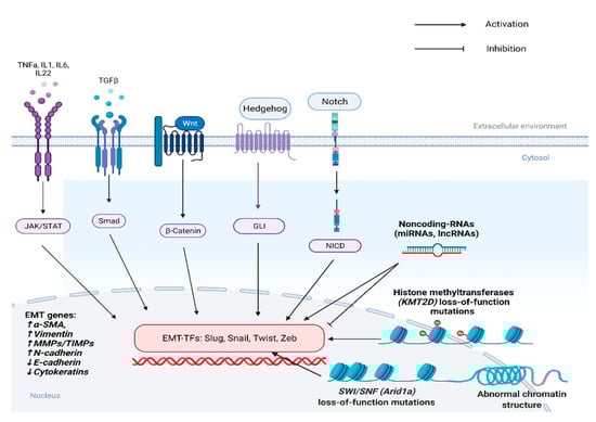 Multiple signaling pathways and epigenetics factors, including histone methyltransferases, chromatin remodeling complexes, and noncoding-RNA molecules control EMT in PDAC. (a-SMA: alpha Smooth Muscle Actin, MMPs: Matrix Metalloproteinases, TIMPs: Tissue Inhibitors of Metalloproteinases).