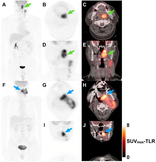 - Plaxton, N.A.; Brandon, D.C.; Corey, A.S.; Harrison, C.E.; Karagulle Kendi, A.T.; Halkar, R.K.; Barron, B.J. Characteristics and Limitations of FDG PET/CT for Imaging of Squamous Cell Carcinoma of the Head and Neck: A Comprehensive Review of Anatomy, Metastatic Pathways, and Image Findings. AJR Am. J. Roentgenol. 2015, 205, W519–W531. [Google Scholar] [CrossRef] [Green Version]