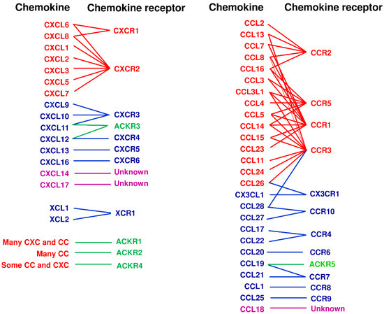 The chemokine superfamily. Inflammatory chemokines and their receptors are indicated in red. Immune chemokines (homeostatic/dual chemokines) are indicated in blue. Atypical chemokine receptors are indicated in green. Chemokines with unknown receptors are indicated in purple. The lines indicate well-established agonistic interactions. Antagonistic or indirect interactions are not shown.