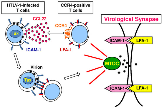 The CCR4 gene is not inducible by Tax [95]. Nevertheless, HTLV-1-infected T cells mostly express CCR4 [95]. Thus, although HTLV-1 is capable of infecting various types of cells including CD4+ T cells, CD8+ T cells, monocytes, and DCs [77], CCR4+CD4+ T cells appear to be the preferential target cells for viral transmission and/or persistency [95]. For the preferential transmission of HTLV-1 to CCR4+CD4+ T cells, the following scenario is now considered (Figure 2). First, we and others have shown that intercellular adhesion molecule 1 (ICAM-1) is strongly upregulated in HTLV-1-infected T cells by Tax [96,97]. Second, we and others have also shown that CCL22, one of the CCR4 ligands, is potently induced in HTLV-1-infected T cells by Tax [76,98]. Accordingly, HTLV-1-infected T cells express ICAM-1 at high levels and abundantly produce CCL22. Thus, HTLV-1-infected T cells preferentially attract CCR4-expressing T cells via CCL22. Furthermore, as chemokines are generally known to activate integrins, CCL22 activates lymphocyte function-associated antigen 1 (LFA-1), an integrin, expressed on attracted CCR4-expressing T cells to promote its firm binding to ICAM-1 expressed on HTLV-1-infected T cells. This triggers reorientation of the cytoskeleton and polarization of the microtubule organizing center (MTOC) towards the cell–cell junction in HTLV-1-infected T cells, leading to the formation of a virological synapse, “the virus-induced specialized area of cell–cell contact that promotes the directed transmission of the virus between cells” [76]. The virological synapse thus permits the efficient transmission of HTLV-1 virions from HTLV-1-infected T cells to uninfected CCR4+CD4+ T cells [76,98]. In addition, CCL22 production by HTLV-1-infected T cells may also help their survival by attracting Treg cells to generate an immunosuppressive microenvironment [99].