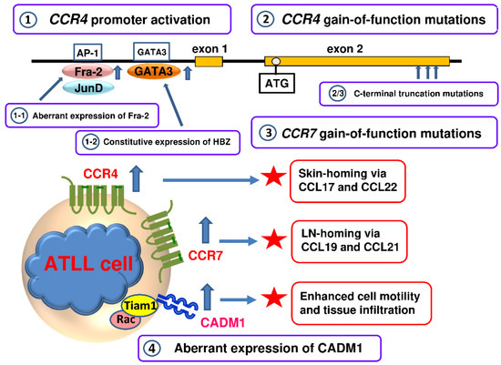Collectively, multiple mechanisms have been found to be involved in the enhanced expression of CCR4 in ATLL (Figure 3). The expression of CCR4 and that of CCR7 account for the frequent infiltration of the skin and SLOs in ATLL, respectively (Figure 3). Furthermore, the frequent gain-of-function mutations in CCR4 and CCR7 in ATLL strongly suggest selective advantages of constitutive expression of CCR4 and CCR7 in ATLL with respect to cell proliferation and/or survival in the tissue microenvironment [118,119,120]. Yet another important surface molecule that is overexpressed by ATLL is cell adhesion molecule 1 (CADM1)/tumor suppressor in lung cancer 1 (TSLC1) [121,122]. CADM1 is not expressed on normal T cells but is highly expressed on HTLV-1-infected T cells and thus provides the best single surface marker of HTLV-1-infected T cells [122,123]. Furthermore, CADM1 expression tends to be higher in carriers in disease progression and in HAM/TSP patients whose symptoms are worsening [124,125]. CADM1 has been shown to interact with T-lymphoma invasion and metastasis 1 (Tiam1) via the cytoplasmic domains and induces the formation of lamellipodia through Rac activation, thus enhancing migration and tissue infiltration of HTLV-1-infected T cells and ATLL cells [126] (Figure 3).