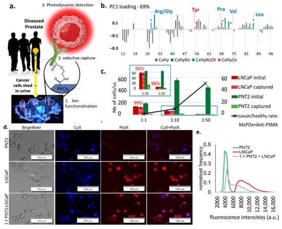 (a) Schematic representation of the cell capture device showing the 3 essential steps to its working principle: 1. the microchannel biofunctionalization; 2. the selective cell capture, and 3. the HAL-induced photodynamic detection. (b) ToF SIMS principal component analysis of the greatest variance between the pristine PPOx coating and the PPOx following the biofunctionalization with anti-PSMA antibody. Arg/Gly, arginine/glycine; Tyr, tyrosine; Pro, proline; Val, valine; Leu, leucine; CxHy, compounds contain C, H; CxHyNz, compounds contains C, H, N; CxHyNzOt, compounds contains C, H, N, O; CxHyOz, compounds contains C, H, O. (c) Numbers of prostate cells captured in the biofunctionalized microchannels for cancer to normal prostate cell ratio 1:1, 1:10 and 1:50, showing the selective cell capture % in red. MePOx, methyl polyoxazoline. (d) microscopic images showing the PpIX fluorescence in prostate cancer LNCaP and in mix cell suspension after being treated with HAL compared to normal prostate PNT2 cells. Scale bars represent 100 µm, magnification 10×. Cy5, cyanine-5. (e) corresponding fluorescence intensity histograms, showing distinct peaks of maximum fluorescence for healthy and PCa cells.