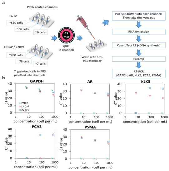 qRT-PCR of prostate cells captured in PPOx channels. (a) experiment schematic. RT, room temperature. (b) gene expression levels (GAPDH, AR, KLK3, PCA3, and PSMA) for normal prostate PNT2 and prostate cancer LNCaP and 22Rv1 cells spiked in different cell numbers.