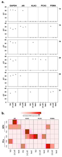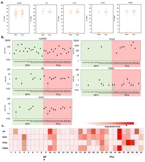 The mRNA expression of each tested gene was quantified by qRT-PCR in the RNA samples extracted from the urinary sediments. The results were first examined in terms of the presence or absence of gene expression in a 1 mL urine sample (Figure 3a). GADPH results indicate that cells were present in all urine samples, with similar levels in benign prostatic hyperplasia (BPH) and PCa samples. Cells expressing any prostate-related genes were present in 70.97% of samples suggesting only 29.03% of cells (expressing GAPDH only) were not of prostate origin, with a higher percentage of prostate cells in the PCa samples compared with BPH (KLK3: 11/15 in PCa patient and 5/16 in BPH patient; AR: 10/15 in PCa patient and 6/16 in BPH patient). PCA3 and PSMA are overexpressed in prostate cancer; thus, they were used as PCa-specific biomarkers in our test [46]. These PCa-specific markers were detected in a greater number of patient samples from the PCa patient group compared with the BPH group (PCA3: 7/15 in PCa patient and 2/16 in BPH patient; PSMA: 9/15 in PCa patient and 5/16 in BPH patient), suggesting PCa samples contain higher numbers of PCa cells. It is worth noting here that PSMA is also expressed on the membrane of other cancers [47] and can be seen in benign brain, kidneys, small intestine, and prostate cells, though in much lesser amounts [48].