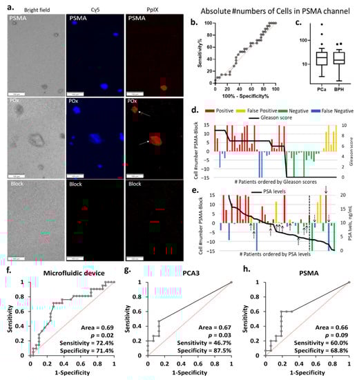 (a) Representative PpIX fluorescent images of the block, PSMA, and PPOx microchannels after rinse. Little to no cells seen in the block channel. Conversely, more non-specific cells and debris were captured in the PPOx channel (white arrows). Scale bars represent 100 µm. (b) ROC curve and (c) box plots of the absolute numbers of cells captured in the PSMA channels for PCA (n = 29) and BPH (n = 21) patients groups, ▪ and • represents outliers; absolute number of PpIX fluorescence cell as a function of the patient (d) Gleason scores and (e) PSA levels. Receiver operating characteristic (ROC) curves for PCa diagnosis of patient urine samples in (f) microfluidic device, (g) urinary PCA3, and (h) PSMA by qRT-PCR.