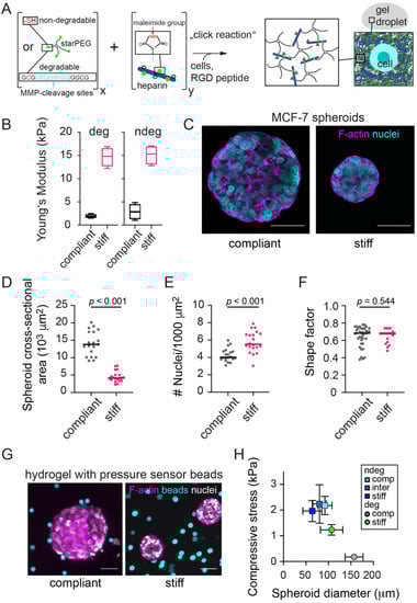 Figure 1. Hydrogel stiffness reduces the growth of MCF-7 spheroids. (A) Schematic of the PEG-heparin hydrogel system, into which initially single cells were embedded. (B) Elastic (Young’s) modulus for compliant and stiff hydrogels determined by AFM. n = 5–7 gels. (C) Representative confocal microscopy images of MCF-7 spheroids formed in a compliant and stiff degradable gel. Spheroid cultures were stained for F-actin and nuclei using Phalloidin-TRITC and DAPI respectively. Scatter plots showing (D) Cross-sectional area of MCF-7 spheroids in compliant and stiff degradable gels. Medians are indicated by a line. n = 20 spheroids each. (E) Number density of cells per unit area of cross-section of MCF-7 spheroids in compliant and stiff degradable hydrogels. n = 20 spheroids each. (F) Shape factors of tumor spheroids. (DF) Shapes, sizes and densities were determined from confocal microscopy images of Phalloidin-TRITC/DAPI stained spheroid cultures using FIJI. A Mann–Whitney test was performed for statistical analysis (p-values are given). Spheroids analyzed after 14 days of culture. (G) Representative confocal microscopy images of MCF-7 spheroids that had grown together with elastic polyacrylamide beads in a compliant and stiff degradable gel as described in [30]. Spheroid cultures were stained for F-actin and nuclei using Phalloidin-TRITC and DAPI respectively; beads were fluorescently conjugated. (H) Compressive stress estimated from bead deformations as a function of the final spheroid diameter reached on day 14. Means +/− SEM are shown. All scale bars correspond to 50 µm.