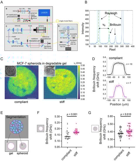 Figure 2. MCF-7 spheroids in stiff degradable hydrogels show an increased Brillouin frequency shift. (A) Combined confocal Brillouin microscopy setup. It consists of (a) illumination source, (b) confocal microscope, (c) Brillouin spectrometer. Abbreviations: FPI = Fabry–Pérot interferometer, PBS = polarizing beam splitter, VIPA = virtually imaged phased array. Adapted from Bakhshandeh et al., 2021. (B) Spectrum for a sample obtained from the setup consisting of Rayleigh peaks and Brillouin peaks as highlighted. (C) Representative Brillouin maps of MCF-7 spheroids grown in a compliant and stiff degradable PEG heparin hydrogel. Insets are brightfield images of the mapped spheroids. Scale bars correspond to 50 µm. (D) Line profiles of the Brillouin frequency shift across spheroids grown in compliant and stiff hydrogels. (E) Brillouin maps were segmented for hydrogel and spheroid area. (F) Scatter plot showing Brillouin frequency shifts for compliant and stiff degradable hydrogels. n = 31–32 spheroids each. Medians are indicated by a line. (G) Brillouin frequency shifts for MCF-7 spheroids in compliant and stiff degradable gels. n = 36–37 spheroids each. A Mann–Whitney test was done for statistical analysis (p-values are given). Spheroids analyzed after 14 days of culture.